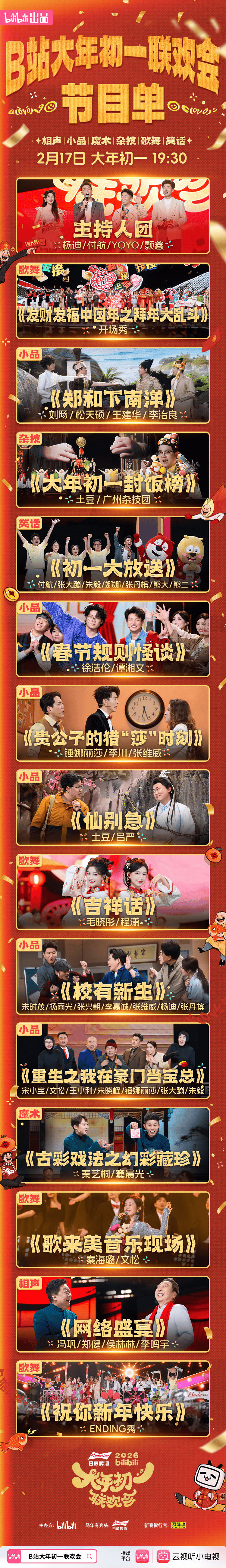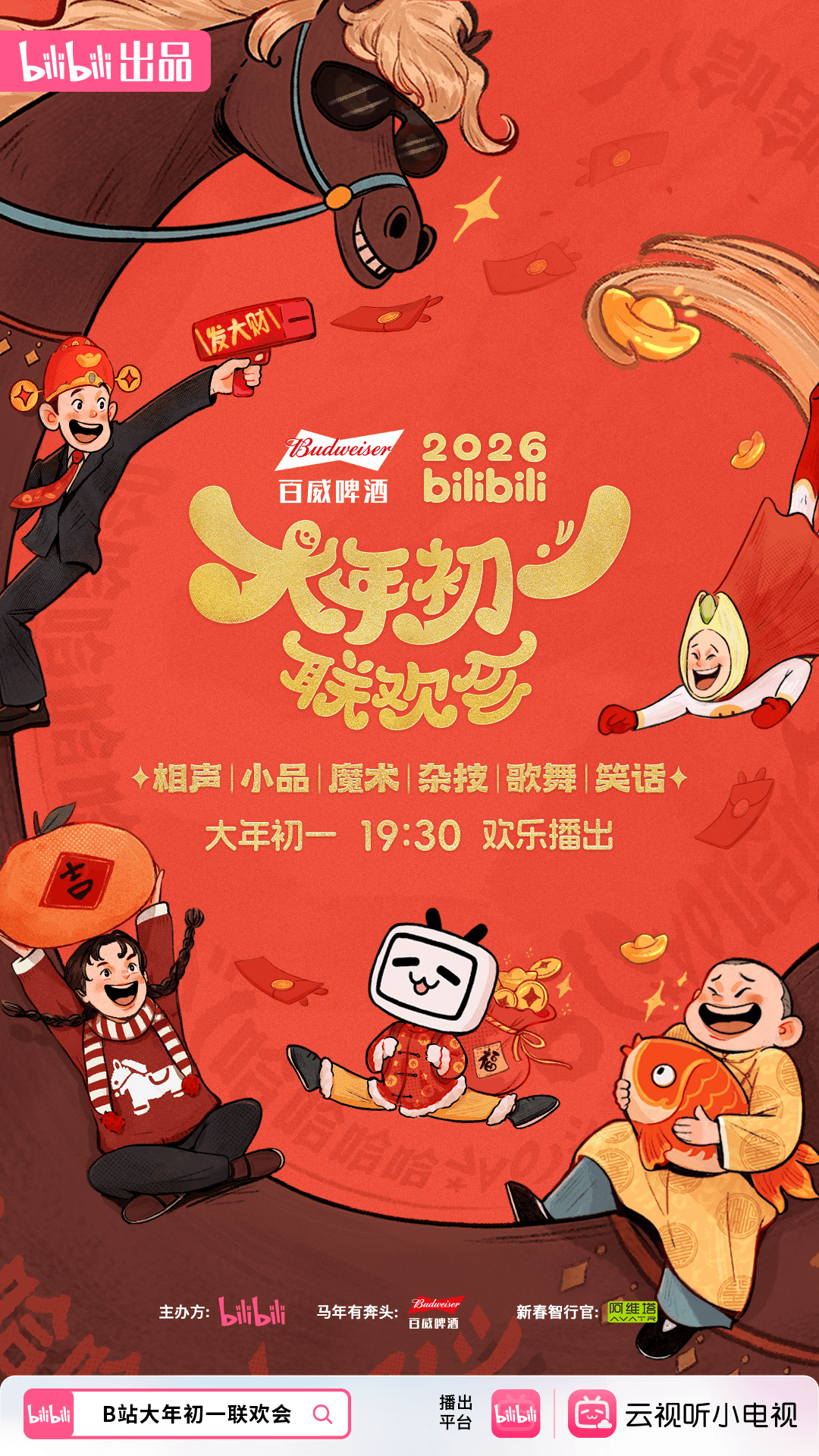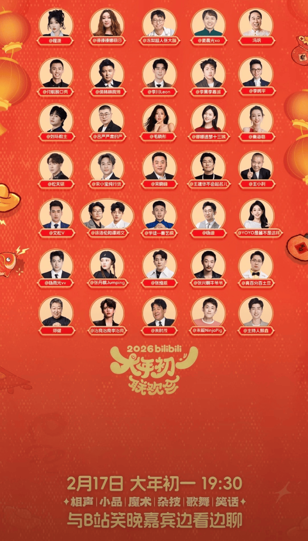 今年大年初一,B站正式官宣了全新IP:“2026 bilibili 大年初一联欢会”(下文简称“B站春晚”)。继跨晚、毕业歌会之后,B站显然想在春节档这个传统战场,再给年轻人造一个精神主场。