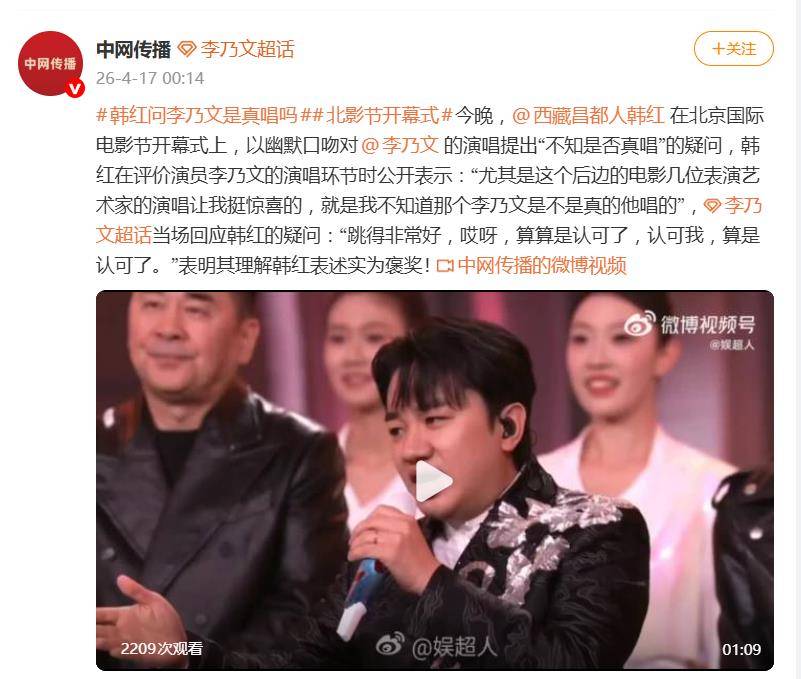 然而,真正的高能点评在后头。韩红将目光投向了后续登台表演的几位电影人,特别点名了一位演员:“尤其是后面几位表演艺术家的演唱让我惊喜,我不知道这个李乃文是不是真的他唱的。”这句带着浓厚疑惑和惊喜口吻的点评,瞬间点燃了现场气氛。