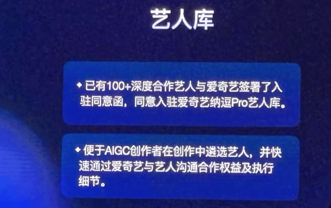 风暴的引线,是“AI艺人库”。在大会现场,爱奇艺高级副总裁刘文峰宣布:已有超100位爱奇艺深度合作艺人同意入驻纳逗Pro艺人库。在大会现场,超过百位演员的照片被放进同一张PPT墙面,丞磊、曾舜晞、马苏、蒋龙等百位演员写真位列其中。刘文峰强调,AIGC创作者可在库中遴选艺人,并可通过平台快速与艺人沟通合作权益及执行细节。
